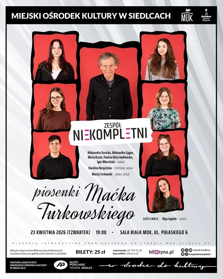 W Sali Białej MOK w Siedlcach szykuje się spotkanie z muzyką, która lubi bliskość i uważne słuchanie. 23 kwietnia 2026 r. na scenie pojawią się Piosenki Maćka Turkowskiego w wykonaniu zespołu Niekompletni z gościnnym udziałem Olgi Jagieło 🎶